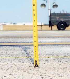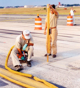 La Base Andrews de la Fuerza Aérea Norteamericana ubicada en Maryland EE.UU.,es quizás la más famosa por ser el hogar de los dos aviones Boeing que sirven al Presidente de los Estados Unidos como la aeronave “Air Force One”. En 1999, se desarrolló un surco profundo de dos pulgadas en la pista principal que utiliza el Boeing “Air Force One”, la pista 1L/19R. Una investigación de ingeniería reveló que el asentamiento fue causado por la infiltración de agua en el sistema del pavimento y el transporte de partículas de suelo a través de una alcantarilla que presentaba fugas por debajo de la pista. El pavimento asentado necesitaba ser reconstruido o reparado para restaurar las operaciones de esta pista esencial, por lo que la Fuerza Aérea de EE. UU.